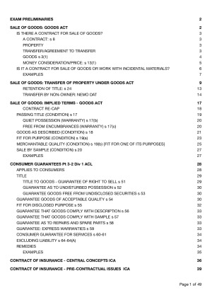 Covers all topics: SALE OF GOODS - Goods Act - Transfer of property - Implied terms CONSUMER GUARANTEES CONTRACTS OF INSURANCE - Central concepts - Pre-contractual issues - Post contract