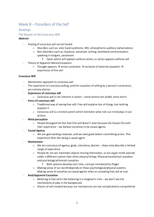 Thanks for checking out my notes. I received a grade of 96 for this unit and received an academic excellence award. I have a WAM of 90 overall. These notes include all important pieces of course content that I completed, including readings and tutorials. I hope you find my notes helpful and best of luck in this unit! Contents: Week 1 - Introduction Lecture Readings Tutorial Week 2 - Dyslexia Readings Lecture Tutorial Week 3 - Aphasia Lecture Tutorial Week 4 – Specific Language Impairment Lecture Tutorial Week 5 – Agnosia Reading Lecture Tutorial Week 6 - Amnesia Lecture Tutorial Week 7 – Learning Lecture Tutorial Week 8 – Disorders of the Self Readings Lecture Tutorial Week 9 – Delusions Readings Lecture Week 10 – Delusion and Hypnosis Reading Lecture Week 11 – Schizophrenia Lecture Tutorial Week 12 – Synaesthesia Lecture Week 13 – Exam Revision Tutorial