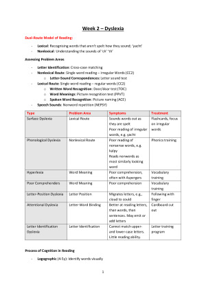Thanks for checking out my notes. I received a grade of 96 for this unit and received an academic excellence award. I have a WAM of 90 overall. These notes are a summary of my full unit notes (also sold on Student VIP) and include the most important pieces of information, with key parts highlighted in red text. I hope you find my notes helpful and best of luck in this unit! These notes cover all content from weeks 1-12 including: W1: Introduction W2: Dyslexia W3: Aphasia W4: Specific Language Impairment W5: Agnosia W6: Amnesia W7: Autism Spectrum Disorder W8: Disorders of Self W9: Monothematic Delusional Belief W10: Hypnosis W11: Schizophrenia W12: Synaesthesia