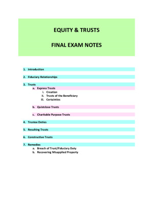 UniMelb JD EQUITY AND TRUSTS Exam Notes: I used these step-by-step hypo exam notes to receive a H1 on the final exam. They are UPDATED with new and relevant cases. It provides detailed case notes, structured hypothetical steps with a checklist and provides the relevant sections of the Act for Trustee Duties. These notes are easy to use, comprehensive, and will give you a direct guide on how to answer a hypothetical, and succeed in the exam.
