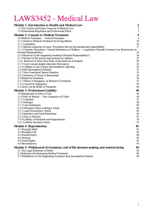 These are the ultimate medical law notes that will provide you with order and structure in how you approach problem questions. I have produced a clear scaffold structure that is EASY to read and navigate through. I have completed all the readings this semester, watched the lectures, combed through other notes to get the key information to help you achieve that D/HD. Don't bother reading the cases, just read these notes and you will be set. ✓ Succinct information ✓ Comprehensive ✓ Colour-coded for easy reading Notes are also colour coded so that you can easily determine what is relevant. Light blue = key principle Pink = Cases Dark blue = legislation Red / bold = anything super key to point out Topics 1. Introduction to Health and Medical Law 2. Consent to Medical Treatment 3. Professional Liability 4. Reproduction 5. Withdrawal of treatment, end of life decision making and assisted dying