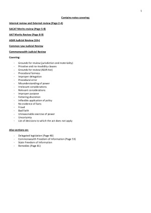 Comprehensive notes on whole syllabus, with cases and explanations, alongside examples of legislation being applied. Covers: - Internal review - External review - Merits review - Judicial Review (ADJR, Common Law, Cth) - Freedom of information - Delegated Legislation - Remedies Alongside a whole host of topics within judicial review such as grounds, procedural fairness, improper delegation, uncertainty, unreasonable exercise of power, etc.