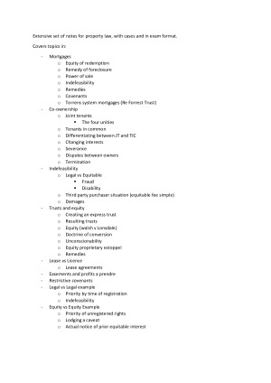 Extensive set of notes for property law, with cases and in exam format. Covers topics across - Mortgages - joint tenants - tenants in common - indefeasibility - trusts and equity - lease vs licence - legal vs equitable - equitable vs equitable - restrictive covenants - easements and profits a prendre - remedies - damages