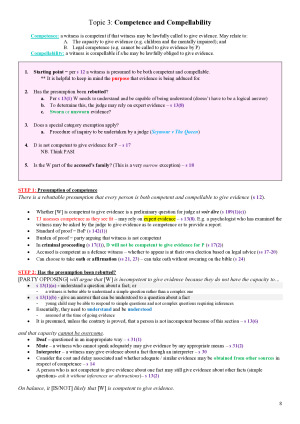 These notes cover the topics in LAW4323 Evidence at Monash University in Sem 2 2022. I have set them out in a simplified exam structure which I used in the exam. The notes on the topic of illegally obtained evidence are shortened because that was the topic of the assignment. Topics include: - General principles - Relevance - Competence & compellability - Privilege - Examination of witnesses - Character & credibility evidence - Right to silence - Tendency & coincidence evidence - Hearsay - Admissions - Illegally obtained evidence - Opinion evidence