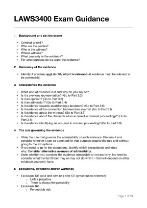 This is a final exam note prepared for Evidence Exam, includes relevant tests, case law and the Evidence Act in detail. Topics include: 1. Exam Guidance 2. Relevance 3. Hearsay 4. Admissions 5. Opinion Evidence 6. Tendency and Coincidence 7. Credibility and Character Evidence 8. Identification Evidence