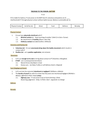 This is an exam-ready notes. Not too detailed. This notes cover the following topics: 1. Trespass to the Person - Battery - Assault - False Imprisonment 2. Trespass to Property 3. Defences - Self-defence - Other defences 4. Negligence - Duty of Care (and other Special Duties) - Breach - Causation - Remoteness - Defences (Contributory Negligence, Volenti Non Fit Injuria, Illegality) 5. Remedies 6. Vicarious Liability. Used this for my exam and got 85. Final grade for the unit is 83.