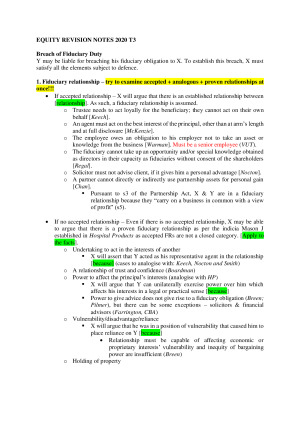 Templated notes. The topics included are: 1. Breach of Confidence 2. Breach of Fiduciary Duty - fiduciary relationship - scope of relationship - breach - defences - third-party liability 3. Personal Remedies 4. Proprietary Remedies 5. Tracing 6. Assignment Exam grade is 90. Final grade is 85 - 2nd in cohort. Warning: please use these notes merely as guide. You must avoid engaging in academic dishonesty.