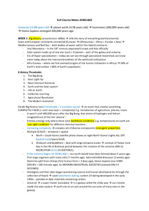 This is a succinct set of summary notes for the entire course (weeks 1-13) that follow the course textbook topics. These notes are crucial for the end of semester exam. I have included all key definitions and relevant case studies across the content. Weekly topics: Week 1: Big History/Introduction: Asia's cosmic address Week 2: The Universe, the Earth and Asia Week 3: Collective learning and paleolithic lifeways Week 4: Cities, states and agrarian civilisations Week 5: The expansion of Agrarian civilisations: the Chinese empire Week 6: Networks of exchange: the Silk Roads Week 7: The modern revolution Week 8: Modern states, nationalism and imperialism Week 9: Global crisis and conflicts Week 10: India: The end of Empire Week 11: The Cold War Weeks 12-13: Our global world/The Anthropocene and the near future