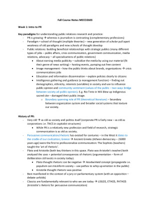 This is a succinct set of summary notes for the entire course (weeks 1-13). These notes are crucial for all the assessments, especially the list of PR tactics/explanation about their application. Weekly topics: Week 1: Intro to PR Week 2: Campaigns & comms plans Week 3: Strategies & evaluation Week 4: PR tactics, stunts & texts Week 5: Persuasion, ethics & the law Week 6: Corporate: external & internal Week 7: Issues management & public affairs Week 8: Digital trends Week 9: Crisis communication Week 10: Political PR & gov. comms Weeks 11-12: Community engagement & Guest Lecture tips