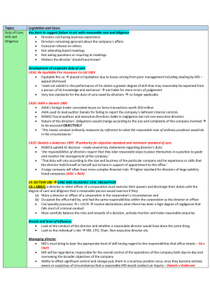 Topics Covered: Types of Companies and Partnerships Formation, Lifecycle and Corporate Liability Corporate Constitutions Company Meetings and Appointment & Removal of Directors and Financial Reporting & Auditing ASIC's Role in Regulation Companies and Markets Overview of Corporate Governance Directors Duties: Duty of Care, Skill and Diligence, Insolvent Trading, Duty to Act in Good Faith and Proper Purpose, Duty to Disclose Conflicts of Interest, Self Interest in Related Party Transactions, Improper Use of Position Shareholder Remedies