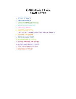 While these notes cover the entire topic in depth, they are completely colour-coded and organised for easy understanding. They are structured according to the process of answering an exam or assignment question and include relevant references and case summaries. Topics covered include: - Maxims of Equity; - Undue Influence; - Unconscionable Bargains; - Breach of Confidence; - Fiduciary Duties; - Equitable Estoppel; - Failed Joint Endeavours (Constructive Trusts); - Equitable Remedies; - Establishing a Trust; - Alternatives to Trusts; - Duties, Powers, and Rights; - Secret/Half-Secret Trusts; - Void and Voidable Trusts; and - Breaches of Trust. Equity and Trusts is a complex topic and can be very confusing, particularly in exam conditions where you may be faced with the task of identifying and addressing a range of issues. These notes are designed to progress through each important question in a logical order and provide key cases and phrases where required.