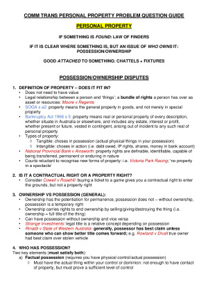 Commercial Transactions problem question guide; provides what cases and what legislation to cite here, steps through each answer possibly accessible on your final exam. HD grade attained using only these materials for final exam. - personal property: law of finders, possession/ownership disputes, chattels vs fixtures - secured transactions under PPSA - competition and consumer law