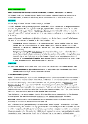 Extensive set of notes that has been summarized, including cases with explanations, covering large sections of the corporate law syllabus. Summarized for exams. Covers: Liquidation - insolvency - Voluntary administration - restructuring - priorities of debts Remedies - for breach of directors duties (see my other directors duties notes) - penalties - members remedies - injunctions, statutory derivative action, oppression, winding up. Variation of class rights