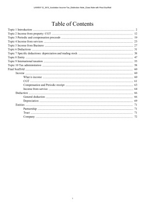 LAWS5112&3412 Australian Income Tax is a very rewarding subject. This notes include (1) a detailed calss notes with careful explanation to the important key points and take aways, (2) numerical smaple questions helping illustrating the difficult definitions and calculation methods, (3) a clear scaffold that help me to get distinction mark in the final exam. The content of this note includes: 1. Introduction 2. CGT 3. Periodic and compensation proceeds 4. Income from service 5. Income from business 6. Deductions 7. Specific deductions: depreciation and trading stock 8. Entity 9. International taxation 10. Tax administration 11. Final scaffold
