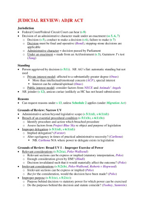 These comprehensive flowcharts and sample exam script answers helped me achieve a HD for this unit (namely scoring an 86% in the exam). These flowcharts comprise a summary of the course, and are an excellent framework upon which you can structure your notes and write your exam answers in an efficient and precise manner. These notes an overview of all relevant examinable topics: - Merits review and remedies - Judicial review (both under ADJR Act and common law) - Preliminary issues for judicial review (jurisdiction, standing and reasons) - All relevant grounds of review (narrow UV, broad UV, and procedural fairness) - All remedies available under statute and CL All cases and relevant statutory provisions are colour-coded for your convenience. Best of luck with studying administrative law!