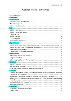 Scaffolds to answer problem questions given in the midsemester and final exam. Topics: - tax principles - income principles - capital gains tax - types of income - personal income - businesses - deductions - trading stock - depreciation - entities - tax admin - avoidance and ethics - international tax