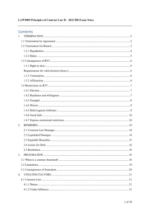 Comprehensive exam notes for LAW5005 Principles of Contract Law B including examples, introductory sentences and step-by-step answer structure. These notes enabled me to achieve an HD in the unit. Topic 1: Termination Topic 2: Remedies Topic 3: Frustration Topic 4: Vitiating Factors