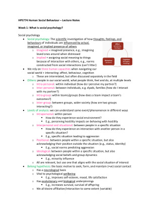 These notes are extremely detailed and cover all lectures. They are easy to search which makes them ideal for using during the exam. I was able to achieve a score of 85 by utilising these notes. The following topics are covered: Week 1: What is social psychology? Week 2: Doing social psychology Week 3: Social cognition and perception Week 4: Emotions and affect Week 5: Self and identity Week 6: Attitudes and persuasion Week 7: Social influences Week 8: Group processes Week 9: Intergroup relations Week 10: Close relationships I have used coloured, bold, and underlined text, arrows, tables, and diagrams to make the content clear and easy to navigate.