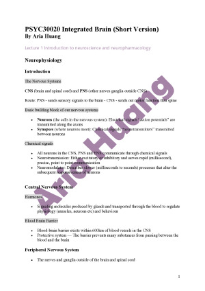 This has to be the most convenient notes for PSYC30020 you can find! Perfect for preview before the semester and revision during the semester I have made two versions for this subject, mainly because of the size of the document. There are 20 lectures in total (2 per week) and my own notes include not only the things on the slides but also in the readings, from online resources, from what the lecturers have said, from discussion board. This is the **Short Version** which is perfect if you just want the core information and a structure. If you are looking for everything that I have noted, you can check out the **Extended Version** in my listing. I have put the same topic for both versions in the sample so that you can see the difference and choose one based on your own needs. The main features of this note that other notes do not have: - During the semester I have grouped things in toggle lists based on relevance —- you can see them in grey highlight - Since I have no science background, I have written down relevant resources I researched online to help me understand certain concepts. So if you are just like me and wanna learn more about some biological or neuro concept, this is perfect for you as a preview before the semester starts! - Pls note that I was not able to include images in the notes, so it is recommended that you use this with the graphs your lecturer provided in the slides (or you can google relevant concepts yourself, they are all the same just different style/color) The Integrated Brain has been a really difficult subject for lots of students who major in Psychology or Biomed, mainly because students often do not understand everything clearly but just read slides while the assessments are actually more complex than expected and require a good understanding of the concepts. Hope you would find this systematic note helpful! Lecture 1 Introduction to neuroscience and neuropharmacology Lecture 2 Stress and the brain Lecture 3 Fear condition and extinction Lecture 4 Sex hormones and the brain Lecture 5 Introduction to motor control Lecture 6 Central control of movement Lecture 7 When brain body interactions fail Lecture 8 Using knowledge of brain body interaction Lecture 9 Introduction to sleep Lecture 10 Homeostatic and circadian regulation of sleep Lecture 11 Sleep neurobiology Lecture 12 Disorders of the sleep control system Lecture 13 The function of sleep Part 1 Lecture 14 The function of sleep Part 2 (Restorative theories) Lecture 15 Sleep and mental health Lecture 16 Peer review live lecture — please refer to the lecture in your semester Lecture 17 Acute pain Lecture 18 Chronic pain Lecture 19 Respiratory control and panic disorder Lecture 20 Bringing it all together (Sleep Apnea)