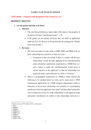 Concise and well-structured Family Law notes incorporating information from textbooks, lectures, seminars and prescribed readings. The notes are structured as a scaffold to be easily applied to a problem question for the final exam. Importantly, the scaffold is consistent with all updates to the Family Law Act as of 2023. The scaffold is split into three components relevant to the final exam: - Property Disputes; - Spousal Maintenance; and - Child Support. The format clearly identifies the steps you must follow when answering a problem question, as well as the law (legislation/case law) which must be applied to the material facts.