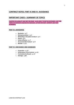 These exam notes enabled me to complete this unit with a super high, 90 High Distinction. As far as I knew, this was the highest grade awarded that year for LAWS105. Extremely useful for current students wanting to be super prepared, and to ace their final exams. Or for those who just want the extra assurance of having detailed but organised notes in their exam arsenal. Also really helpful for revision in the second half of unit, namely, 'avoidance'. It is recommended that these notes should only be used to supplement an already thorough understanding of the topic.