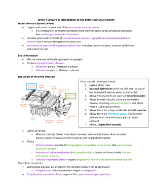 Updated and concise notes that helped me score a H1! To simplify some concepts, I restructured and reorganised the layout of lecture slides in a manner that would be easier to understand and connect. Throughout the semester, I mainly revised off the lecture slides however there were some lectures or lecturers which I found to be difficult to understand. These were mainly lectures that were packed with content which was very overwhelming and confusing when reviewing (particularly ANS and Neuroinflammation ) It was difficult to break down these concepts purely off the lecture slides therefore I decided to write detailed summarises for them. This helped me have a better understanding of the material being taught and at the end, I was able to grasp these concepts very well. These notes include tables, diagrams, annotations and colour coding. I hope these will also help you understand some of the content better :) I have listed down below the lectures in which I summarised: - Lecture 1: Cellular Components of The Brain - Week 4 Lecture 3: Introduction to the Enteric Nervous System - Week 5 Lecture 2: Microbiota 1 - Week 5 Lecture 3: Neuropsychiatry and Microbiota - Week 6 Lecture 1: Autonomic Nervous System - Week 6 Lecture 2: Autonomic Nervous System 2 - Week 6 Lecture 3: Viscerosensory Afferents - Week 7 Lecture 1: Viscerosensory Processing in the Solitary Tract Nucleus (NTS) - Week 7 Lecture 2: Neurogenesis 1 - Week 7 Lecture 3: Neurogenesis II - Week 8 Lecture 1: Respiration 1 - Week 9 Lecture 1: Sympathetic Respiratory Coupling - Week 9 Lecture 2: Foundations of Neuroinflammation - Week 10 Lecture 1: Neuroinflammation and Multiple Sclerosis - Week 12 Lecture 1: Cortical Circuits 1 - Week 12 Lecture 2: Cortical Circuits Planner