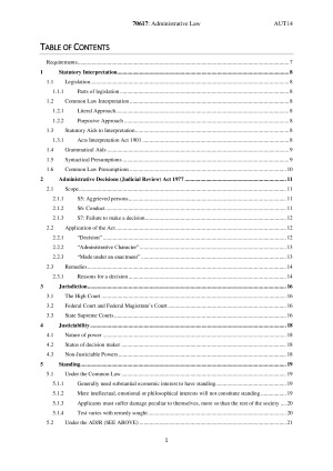 These well-structured comprehensive set of notes are perfect for the Admin Law final exam. Take a look through the preview to check out all the topics covered and see the excellent quality of the notes for yourself! Topics covered include (see Table of Contents in the Preview for more detail): Statutory Interpretation; Administrative Decisions (Judicial Review) Act 1977; Jurisdiction; Justiciability; Standing; Remedies; Grounds for Review; Delegated Legislation; Privative Clauses; Human Rights; Merits Review; Administrative Appeals Tribunal; Ombudsman; Freedom of Information; Integrity Branch; Privacy.