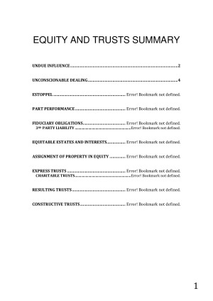 These concise, well-structured and well-formatted set of notes are perfect for the final exam. Take a look through the preview to check out all the topics covered and the quality of the notes for yourself! Topics covered include: 1. Undue Influence 2. Unconscionable Dealing 3. Estoppel 4. Part Performance 5. Fiduciary Obligations & 3rd Party Liability 6. Equitable Estates and Interests 7. Assignment of Property in Equity 8. Express Trusts 9. Charitable Trusts 10. Resulting Trusts 11. Constructive Trusts