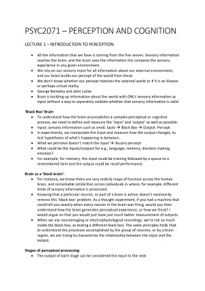 HD PSYC2071 (Perception and Cognition) lecture notes Topics covered in notes on perception include: Introduction to perception, overview of the early visual system, visual cortex and dorsal visual stream, ventral visual stream, mid-level vision, object perception, high-level visual representations, computational approaches to face perception, the science of expertise and expertise in professional settings. Topics covered in notes on cognition include: cognitive psychology (history and philosophy), similarity, reasoning, an integrative case study, attention and memory.