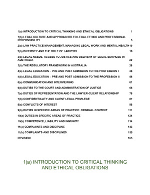 Full set of notes that are EXTREMELY comprehensive. They include ALL readings and ALL statutory excerpts from the reading guide. These are perfect to help you study for essay components in the final exam especially. Benefits of my notes - All readings have been done and included (see white and yellow boxes) - All statute has been included (see green boxes) - Detailed case summaries - 150+ pages of notes with 70,000+ words You wont be disappointed! List of topics 1(a) introduction to critical thinking and ethical obligations 1(b) legal culture and approaches to legal ethics and professional responsibility 2(a) law practice management, managing legal work and mental health 2(b) diversity and the role of lawyers 3(a) legal needs, access to justice and delivery of legal services in australia 3(b) the regulatory framework in australia 4(a) legal education – pre and post admission to the profession i 4(b) legal education – pre and post admission to the profession ii 6(a) communication and interviewing 6(b) duties to the court and administration of justice 7(a) duties of representation and the lawyer-client relationship 7(b) confidentiality and client legal privilege 8(a) conflicts of interest 9(b) duties in specific areas of practice: criminal context 10(a) duties in specific areas of practice 10(b) competence, liability and immunity 11(a) complaints and discipline 11(b) complaints and disciplines Goodluck!!