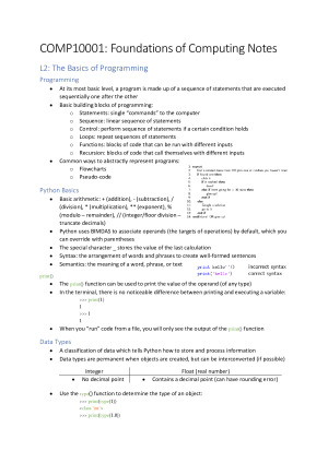 Comprehensive notes I compiled and formatted during my studies, which includes all the content of lectures and tutorials. I hope that they will be useful in your studies as well!! Topics covered include, but are not limited to: • Variables and strings • Conditionals • Loops • Tuples • Commenting • Dictionaries and Sets • Recursion