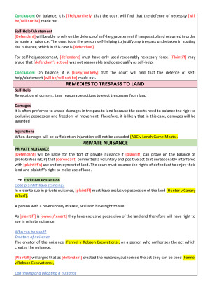 These notes offer a brief outline of the cases and provide structured answers for each offence. The structured answers should be adapted to fit the specific question being answered. The elements of each offence that must be proven are clearly set out for easy access during the exam. The topics covered include: - Trespass to Person (Battery/Assault/False Imprisonment) - Defences to Trespass to Person - Trespass to Land - Defences to Trespass to Land - Private Nuisance - Defences to Private Nuisance - Negligence (General/Special Duty, Breach of Duty, Causation and Remoteness) - Defences to Negligence - Vicarious Liability