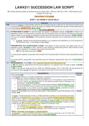 These notes were used to Dux the LAW4311 Succession Law unit in Semester 1, 2021. These are condensed structured notes covering all examinable course material. They distill the course into an easy step-by-step guide and script to follow in the exam. The notes are also colour coded throughout - important information in yellow, legislation in blue, cases in green/pink (depending on whether affirming or negating principles), and orange for links between topics (or references to the Dal Pont textbook). These features make the notes accessible and easy to use to produce HD-level responses in the exam. These notes cover all examinable topics including: * Topic 1 - Introduction; * Topic 2 - Intestacy * Topic 3 - Wills and Will Making * Topic 4 - Mental Elements in Will Making; * Topic 5 - Formalities * Topic 6 - Exceptions to Formalities; * Topic 7 - Changing a Will; * Topic 8 - Construction of Wills; * Topic 9 - Gifts by Will; * Topic 10 - Family Provision; * Topic 11 - Personal Representatives; * Topic 12 - Grants of Representation; * Topic 13 - Functions and Duties of Personal Representatives; * Topic 14 - Powers, rights, and liabilities of Personal Representatives Please ensure you adapt these notes for any changes to the course for your semester. For best results, this should be used in conjunction with the corresponding course notes.