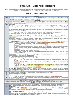These notes were used to Dux the LAW4323 Evidence Law unit in Semester 1, 2021 with Fiona Hum as CE. These are condensed structured notes covering all examinable course material. They distill the course into an easy step-by-step guide and script to follow in the exam. The notes are also colour coded throughout - important information in yellow, legislation in blue, cases in green/pink (depending on whether affirming or negating principles) and orange for links between topics. These features make the notes accessible and easy to use to produce HD-level responses in the exam. * Topic 1 - Introduction * Topic 2 - Relevance * Topic 3 - Competency and Compellability * Topic 4 - Privleges * Topic 5 - Examination of Witnesses * Topic 6 - Credibility and Character * Topic 7 - Accused's Right to Silence * Topic 8 - Tendency and Coincidence Evidence * Topic 9 - Hearsay and Exceptions * Topic 10 - Admissions * Topic 11 - Illegally / Improperly Obtained Evidence * Topic 12 - Opinion Evidence Please ensure you adapt these notes for any changes to the course for your semester. For best results, this should be used in conjunction with the corresponding course notes.