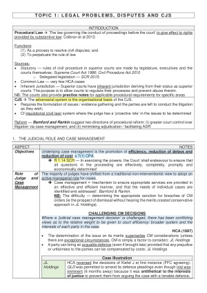 These notes were used to Dux the LAW4303 Litigation and Dispute Resolution unit. These are condensed structured notes covering all examinable course material. They distill the course into an easy step-by-step guide and script to follow in the exam. The notes are also colour coded throughout - important information in yellow, legislation in blue, cases in green/pink (depending on whether affirming or negating principles), and orange for links between topics. These features make the notes accessible and easy to use to produce HD-level responses in the exam. * Topic 1 - Legal Problems, Disputes * Topic 2 - ADR and ODR * Topic 3 - The Cost of Resolving Disputes / Legal Costs * Topic 4 - Jurisdiction * Topic 5 -Parties and Joinder * Topic 6 - Commencing Proceedings, Service, and Appearance * Topic 7 - Representative Proceedings and Class Actions * Topic 8 - Urgent Applications / Protecting Positions * Topic 9 - Defining the Issues in Dispute and Pleadings * Topic 10 - Methods of Gathering Evidence * Topic 11 - Dispositions and Enforcement Please ensure you adapt these notes for any changes to the course for your semester.