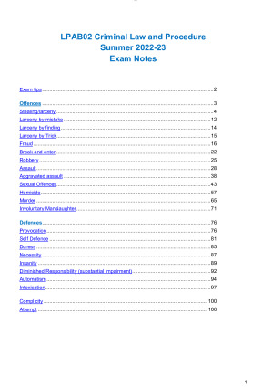 These are the most comprehensive study notes available. Legislation and case law changes so you need current information (eg mind 2022 changes to the Crimes Act regarding sexual assault and consent). It includes exam tips, answer scaffolds, legislation excepts, and relevant cases summaries. All colour coded so you can easily locate the information during an exam. These notes work well if you buy them at the start of the semester and then supplement with your own learnings each week, or if you need to cram (hey life gets in the way sometimes!). Either way you will be in an excellent position with these notes!! About me: I am an excellent student. I have received 1st Class honours in my original undergraduate, have received awards in my masters and spent 10 years lecturing and tutoring at universities. I know what it takes to get good marks at university!!! Topics covered include: - Exam tips - Stealing/larceny - Larceny by mistake - Larceny by finding - Larceny by Trick - Fraud - Break and enter - Robbery - Assault - Aggravated assault - Sexual Offences (includes legislation changes 2022) - Homicide - Murder - Involuntary Manslaughter - Provocation - Self Defence - Duress - Necessity - Insanity - Diminished Responsibility (substantial impairment) - Automatism - Intoxication - Complicity - Attempt