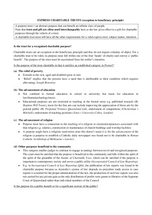 Detailed and concise exam scaffold to approaching problem scenarios in the final exam. The notes cover the following topics: 1. Fiduciary obligations - establishing a fiduciary relationship, breach, applicable defences 2. Assignments of choses in action - covering the various ways of reaching an equitable assignment or assignment at law 3. Creation of express trusts - covering constitution, certainty of intention, certainty of subject matter, certainty of objects, validity 4. Express charitable trusts 5. Administration of trusts - duties and powers 6. Remedies (with a remedies overview table on the last page, page 40) 7. Third-party personal liability 8. Resulting trusts 9. Constructive trusts