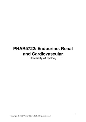 These notes cover all of the lecture material for the course, which includes carefully selected diagrams from the assigned textbook as well as additional images to enhance understanding of the subject matter. The notes are designed for easy reading and comprehension, with helpful definition boxes and other features to aid in learning Topics include: - Renal and urological disorders - Cardiovascular disorders; Cardiovascular risk, Angina, MI, CHF, Stroke, AF - Haematology disorders - Clinical Reasoning - Medication review - Herbal and Complementary Medicines used in Pharmacy - Endocrinology: Thyroid - Endocrinology: Diabetes - Endocrinology: Steroids, Hypothalmic and Pituitary hormone disorders - Endocrinology: Obstetrics and Gynecology - Osteoporosis