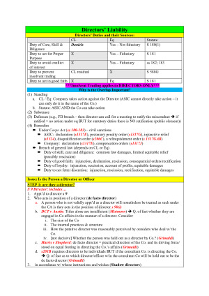 These notes provide the crucial case and legislation references to complete the Business Associations exam with step-by-step instructions for solving specific questions. They are colour coded and extract the fundamental principles in an easy-to-read style. The following topics are covered: - Company types, shares, and registration - Business Associations other than Corporations - Features of a Corporation (Separate Legal Personality, Share Transferability, Perpetual Succession, Limited Liability etc.) - Division of Powers in a Corporation - Decision Making by Shareholders - Attributing Liability: Tort and Criminal Liability - Attributing Liability: Authority of Agents and Contracting - Director's Liability - Director's Duties (Skill, Care & Diligence, Avoiding Insolvent Trading, Good Faith & Proper Purpose, Avoiding Conflicts, Related Party Transactions, Misleading and Deceptive Conduct, etc.) - Remedies and Sanctions for Breach of Director's Duties - Shareholder Remedies - Corporate Groups - Remedies for Insolvent Corporations
