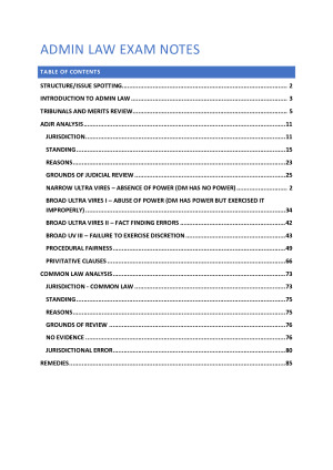 Taken in T1 2023 Covers the following topics: Structure/issue spotting Introduction to admin law Tribunals and merits review Adjr analysis Jurisdiction Standing Reasons Grounds of judicial review Narrow ultra vires – absence of power (dm has no power) Broad ultra vires i – abuse of power (dm has power but exercised it improperly) Broad ultra vires ii – fact finding errors Broad uv iii – failure to exercise discretion Procedural fairness Privitative clauses Common law analysis Jurisdiction - common law Standing Reasons Grounds of review No evidence Jurisdictional error Remedies Used these notes to get a 82 for my overall exam mark (86% for the exam) Includes comprehensive case summaries