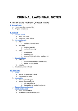The entire course for Criminal Laws - perfect for your final exam!! HD QUALITY BOTH problem question AND essay notes!! Amazing easy to follow summaries of the steps to follow to make out every offence AND summaries of all of the readings/theories to help you construct a great essay! Clearly marked with cases in red and legislation in blue