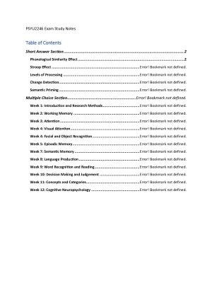 Final exam study notes for cognitive processes! Includes all weeks lecture topics and experiments covered in practical classes. Notes are written in a summary format with key themes and theories further explained. Topics included: - Working memory - Attention - Visual attention - Facial and object recognition - Episodic memory - Semantic memory - Language production - Word recognition and reading - Decision making and judgment - Concepts and categories - Cognitive neuropsychology
