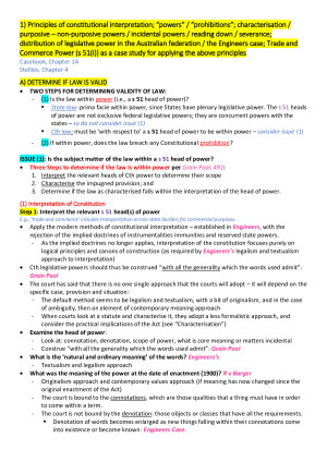Excellent, super detailed course notes and scaffolds prepared by a HD student (1st place in mid-semester assignment)!!! Perfect and very useful for final exam revision!! Topics 1) Introduction, distribution of powers in a federation, principles of constitutional interpretation and characterisation; trade and commerce power (s 51(i)) as case study 2) Inconsistency (s 109) 3) External Affairs (s 51(xxix)) 4) Corporations (s 51(xx)) 5) Freedom of Interstate Trade (s 92) 6) Taxation (+Excise) (ss 51(ii), 55, 90) 7) Grants (s 96) 8) Defence (s 51(vi)) and the Doctrine in the Communist Party Case 9) Implied Freedom of Political Communication 10) Express Rights (s 116 as a case study). 11) Intergovernmental Immunities 12) “Race” (s 51(xxvi))