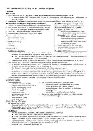 Excellent Exam notes and summaries prepared by a DISTINCTION student - includes both Mid-semester AND Final exam materials!!! Perfect for in-person written exam!! (very easy to follow during exams, concise summaries and scaffolds are tailored for an in-person written law exam). Super useful in the exams!!! The only thing you need to bring into the exam! Topics 1) Introduction to Tax and the Australian Tax System 2) Concepts of Income 3) Income from Property and Capital Gains Tax 4) Income from Services and Fringe Benefits Tax 5) Business Income 6) Deductions – Relevance 7) Deductions – Trading Stock (business taxation) 8) Deductions – The capital/revenue distinction 9) Deductions – Depreciation (business taxation) 10) Entity Taxation: Partnerships, Trusts, and Companies (Imputation) 11) Goods and Services Tax 12) Tax Administration 13) Ethical conduct and rules to counter tax avoidance