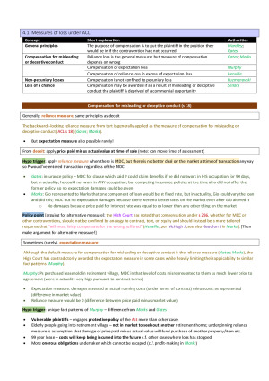 I made these notes to be **very** colour-coded and print-friendly for the final exam. It's the most effort I've ever put into my notes since it's the first time I had to do an in-person one at law school! They go through every topic in close detail while not being too weighed down by heavy text. I have put handy 'policy points' and 'hypo trigger' highlights throughout the document for exam usage. There is definitely enough here for both hypotheticals and essays. Take a look at the sample notes to see for yourself! **DISCLAIMER** that while there is text throughout the document (in a dark yellow) which are sample introductory statements of principle that were meant to be copied into the exam, you should not copy them word for word unless you want to visit the Academic Board lol :) Contains: 1. Overview 2. Compensatory damages for breach of contract 3. Compensatory damages in tort 4. Statutory damages under the ACL 5. Equitable compensation 6. Vindication/punishment 7. Specific performance 8. Permanent injunctions 9. Interlocutory injunctions 10. Lord Cairns' Act damages 11. Gain-based remedies 12. Restitution/unjust enrichment 13. Rescission Good luck with this subject! :)