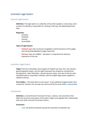 This note included topics that on the exam (not the whole unit) so it only cover partial contract law and fair trading. The covered topics are: 1. Intro to Australian Legal System 2. Legal Reasoning & Sources of Law 3. Business Structures & Relationships 4. Individual & Corporate Liabilities 5. Tort Law, Negligence, Auditor Liabilities 6. Privacy & Data Protection 7. Corporations Law 8. Corporation Directors & Shareholders 9. Director's Duties
