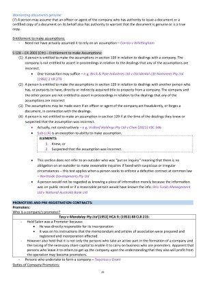 **UNIT COMPLETED IN 2023** This is a fully comprehensive set of notes that additionally contain all requisite sections relating to the topics of: 1. Regulatory framework 2. Types of Companies and Regulation - Internal governance rules – company constitutions and replaceable rules 3. Company Relations with Outsiders – Promoters and Pre-registration Contracts – Fundraising by issue of Securities 4. Membership, Shares, Varying or Cancelling Class Rights, Transactions affecting share capital, Dividends 5. Debentures and Personal property securities, Officers, including directors and secretaries, Ceasing to be a director 6. Duty of Care, Skill and Diligence 7. Directors’ Duties of Good Faith and Proper Purpose – Directors’ Conflicts of Interest Duties 8. Directors’ Conflict of interest duties - Duty to prevent insolvent trading – Remedies and penalties for breach of duty – Exoneration & Relief from from liability for breach of duty 9. Members’ Meetings – Members’ Remedies – ASIC’s investigatory and Information-gathering Powers 10. External Administration in Insolvency Generally – Receivership – Voluntary Administration – Liquidation This set of notes is the ultimate guide to perfecting your result in corporate law! These are literally the ONLY notes needed to achieve an HD on the exam!!