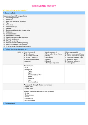 My summary notes have all the key information and steps involved when performing a Primary Survey and a Secondary Survey including a neurological, cardiovascular, respiratory, abdominal, nutritional, musculoskeletal and neuromuscular assessment.