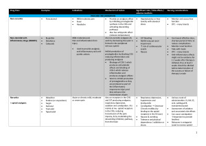 HNN215 Drug Portfolio contains all the drug classes covered in HNN215 Quality Use of Medicine with examples, indications, mechanisms of action, signification risks/ side effects/ adverse reaction and nursing considerations for each drug class. Drug classes included: Pain and inflammation: - Non-narcotics - Non-steroidal anti-inflammatory drugs (NSAIDS) - Narcotics Infection: - Beta Lactams (Penicillins & Cephalosporins) - Glycopeptides - Aminoglycosides - Macrolides - Neuraminidase inhibitors - Polynes Cardiovascular: - Beta Blockers - Calcium Channel Blockers - Antiarrhythmics (Diagoxin & Amiodarone) - Electrolytes - ACE inhibitors - Nitrates - Lipid lowering medications - Anticoagulants (Oral - Aspirin & Warfarin + Injectable - Heparin & Low molecular weight heparins) - Diuretics (Loop, Thiazide and thiazide like & Potassium sparing) Respiratory: - Beta-2 agonists (Short acting & Long acting) - Anticholinergics (Short acting & Long acting) - Corticosteroids (Inhaled & Systemic) - Cardiac stimulants - Local anaesthetics Gastrointestinal Tract (GIT): - GORD (Antacids, Protein Pump Inhibitors & H2 antagonists) - Glycaemic lowering agents - Glucagon (Oral - Sulfonylureas & Biguanides + Injectable - Insulin) - Antiemetics (Setrons & Dopamine antagonists) - Laxatives (Stimulants, Stool softeners, Osmotic & Bulk forming)