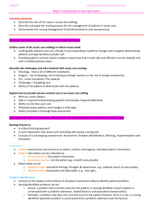 My study notes for HNN227 cover the learning objectives from week 1-7 which includes a mixture of content from readings, lecture/online content and simulation. WEEK 1: INTRODUCTION TO NURSING PRACTICE WEEK 2: CARE OF THE PERSON EXPERIENCING ACUTE IMMUNE CONDITIONS WEEK 3: ACUTE ILLNESS – RESPIRATORY CONDITIONS WEEK 4: ACUTE ILLNESS – CARDIOVASCULAR CONDITIONS WEEK 5: ACUTE ILLNESS – GASTROINTESTINAL CONDITIONS WEEK 6: ACUTE ILLNESS – MUSCULOSKELETAL CONDITIONS WEEK 7: ACUTE ILLNESS – CLINICAL DETERIORAATION